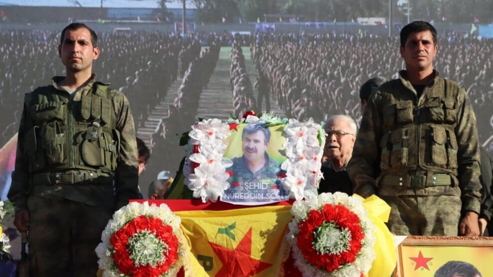 Komutan ve Rojava Devrimi’nin öncüsü Nureddin Sofi’nin cenazesi töreninde konuşan QSD Komutanı Mazlum Ebdi, ‘Kuzey ve Doğu Suriye halkı, Nureddin Sofi arkadaşa devrimdeki emeğinden dolayı minnettardır. Şehitlerin ve halkın huzurunda bıraktığın bayrağı alacağımıza söz veriyoruz’ dedi
